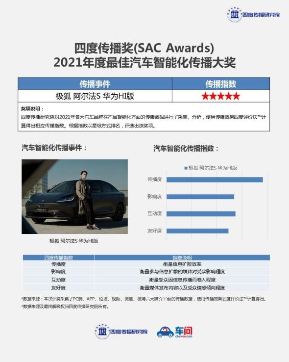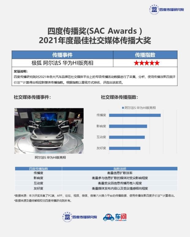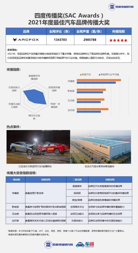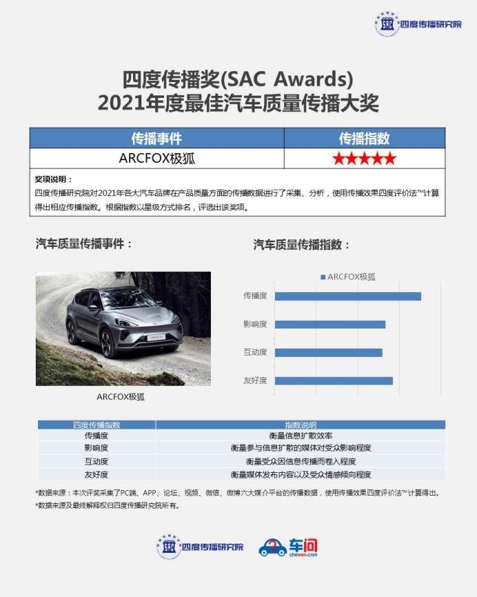 2022年2月8日,车问网与四度传播研究院,正式发布了2021年度中国汽车行业品牌在二十一个细分领域的传播大奖——“四度传播奖(SAC Awards)”。ARCFOX极狐汽车凭借突出的行业表现与出众的品牌影响力,荣膺“2021年度最佳汽车品牌传播大奖”、“2021年度最佳社交媒体传播大奖”、“2021年度最佳汽车质量传播大奖”、“2021年度最佳汽车智能化传播大奖”共四项传播学大奖,受到业界的高度关注,公司品牌价值和行业影响力得到进一步提升。
