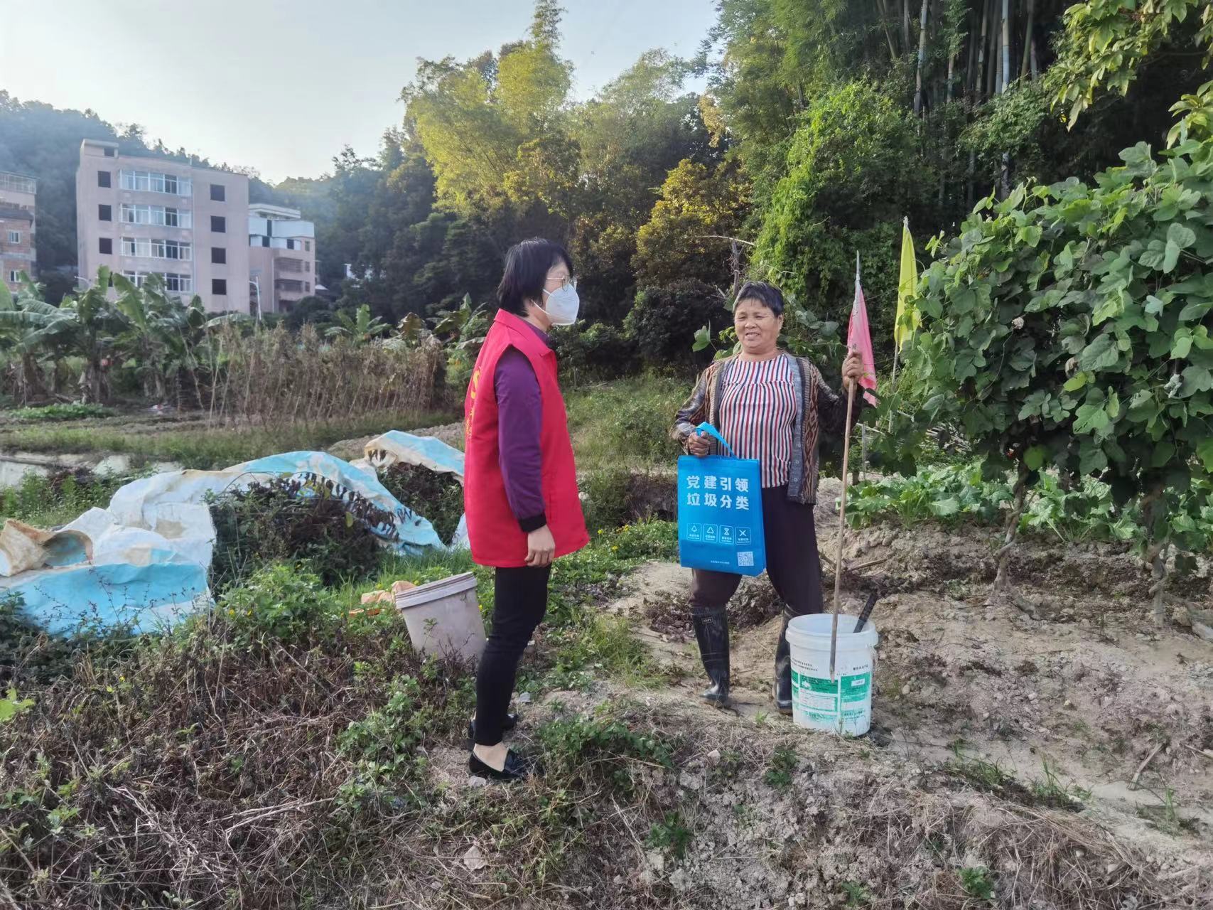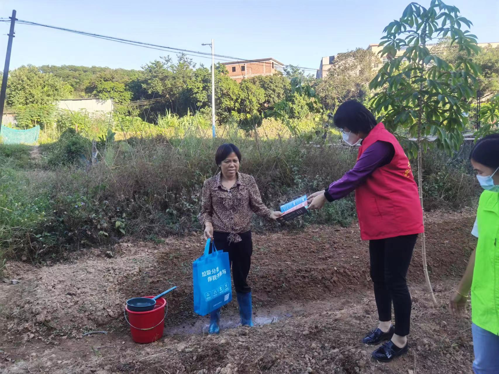 兴丰村党委委员、村委委员、网格001书记许育锋同志带领志愿者、工作人员走进田园向村民派发生活垃圾宣传品和生活垃圾指南宣传单,并用地道的客家话向大家介绍四大类生活垃圾的分类标准及投放小技巧以及强调了生活垃圾分类的重要性。志愿者重点向村民们宣传了农药瓶等田园垃圾的分类投放方法,正确投放垃圾,有利于垃圾的无害化处理,减少水、土壤、大气污染风险。