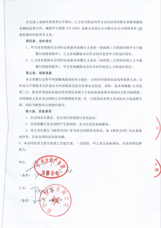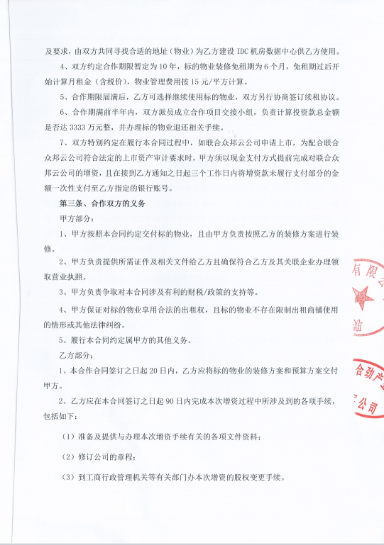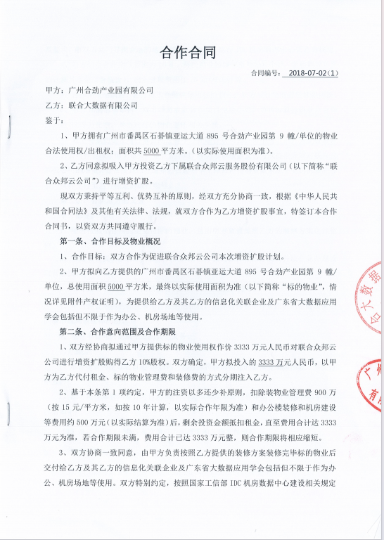 4、2018年7月2日,陈国华利用大数据公司与我们合劲公司签订了一份《合作合同》,合同约定合劲公司用合劲产业园第9栋楼5000平方米物业10年租赁使用权作价3333万元人民币对联合众邦云公司进行增资扩股,因陈国华、萧曼平、陈向东虚构众邦云公司财产及技术价值有3.3亿多元以上(后查实完全虚构),故用3333万元10年的租赁资金增资联合众邦云公司股份为10%,3333万元增资则以大数据公司使用合劲公司9号楼形成的租金、标的物业管理费和装修费的方式作为合劲公司出资分期注入联合众邦云公司。