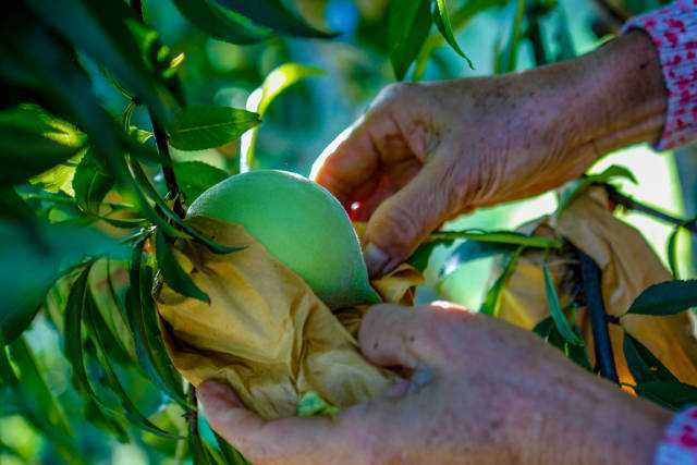 为鹰嘴桃套袋,不仅可以防治果实病虫害,更能提高果实外观和内在品质。(摄影:袁群华)