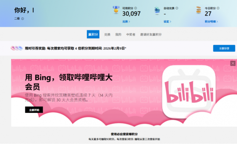 - 微软这波福利有点狠:用7天Bing搜索,就给1个月B站大会员
