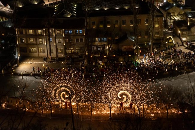 暮色降临后开展河灯祈愿活动,游客亲手点亮河灯放入汤河,寄托牵挂与期盼。圆通塔旁上演古塔铁花秀,省级非遗传承人将高温铁水击打成漫天星火,铁花风火轮等技艺带来震撼视觉体验,展现匠人精神与文化传承力量。