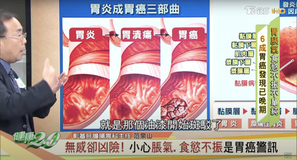 彰基肝胆肠胃科主任范泉山解释,胃癌多属后天性,但不少人胃痛都不以为意,认为只是上腹疼痛,直到胀痛延伸至神经或脸色出现苍白,导致面黄肌瘦才就医,恐怕已是胃癌末期。医师表示,从胃炎演变而成癌,是一种循序渐进的过程。胃发炎造成黏膜受伤,粘膜发生凹陷至肌肉层,导致溃疡,而当胃溃疡反复发炎,细胞坏死再修复,就有可能酿成胃癌。