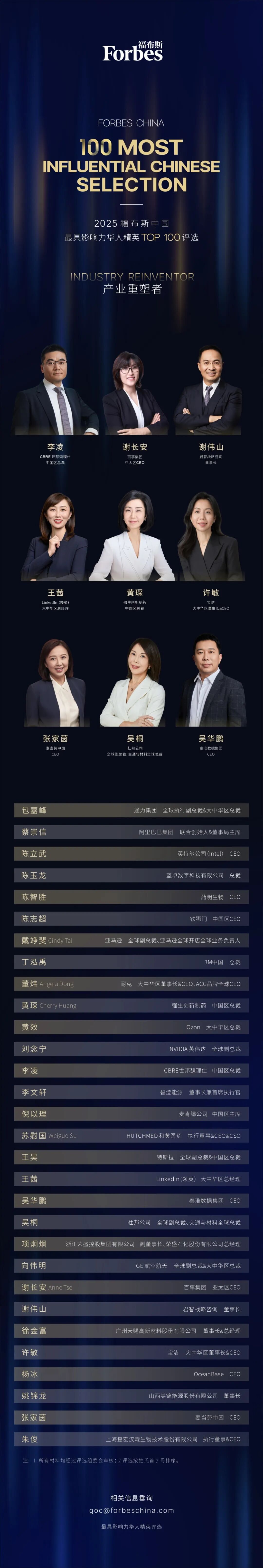 往届蝉联 在入选名单中,一批连续出现的名字格外醒目,那就是往届曾蝉联过的入选者们。他们具备三项共性:其一,他们所领导的企业正处在稳健上升的成长周期;其二,他们在组织中拥有持续提升的战略话语权;其三,他们所在的平台具备强大的全球连接能力——无论是产业链、资本网络还是人才生态。 通力集团全球执行副总裁包嘉峰,在中国城市更新的进程中,以“绿色创新普惠化”为理念,交付了全国最大规模的电梯更新改造项目,惠及数十万居民。他将节能回馈技术普及至全系产品,悄然改变城市建筑的能源使用方式,并投资大湾区推进绿色城市生态布局,让通力成为中国城市现代化与可持续化进程中的标杆。 3M中国总裁丁泓禹以“本土创新 反哺全球”的姿态重塑跨国公司在华发展模式,推动3M中国从制造中心升级为全球研发与协同枢纽,使中国业务成为集团创新网络的核心引擎。 Ozon大中华区总裁黄效则带领团队在中国与独联体国家电商贸易中开辟一带一路机遇下的数字贸易新航道——在他的领导下,Ozon在中国设立总部办公室,带领团队成功帮助数十万中国跨境卖家、优质品牌与制造商入驻平台并实现数百亿规模的交易额。 NVIDIA全球副总裁刘念宁Maggie Liu,代表着亚洲力量在全球AI生态的深度嵌入。她立足中国和亚太区的市场特性和独特文化,帮助NVIDIA全球AI企业生态体系在本地落地和推广,使中国成为NVIDIA全球AI创新的重要策源地。 LinkedIn(领英)大中华区总经理王茜,通过 LinkedIn 的数字化职场平台,连接中国与全球的人才流动,帮助企业打造全球品牌,赋能中国企业在国际舞台上实现可持续增长。LinkedIn不仅是全球领先的职场社交平台,更是跨境人才与品牌生态的重要枢纽。 麦肯锡中国区主席倪以理,持续推动企业可持续发展与数字化转型,为本土及跨国企业制定赢在“下一个中国”的战略规划,成为全球管理咨询领域最具话语权的华人之一。 ATM Capital 创始人屈田与Oak Grove Ventures 管理合伙人Shawn Shi,以前瞻性的全球科技布局,构建起中国资本在全球化新兴赛道的国际影响力。 OceanBase CEO杨冰代表着中国科技基础软件的突破,让国产数据库进入全球核心商业体系,成为技术出海的新符号。 嘉御资本董事长卫哲,则以长期主义的投资逻辑,持续助推中国企业的全球竞争力,为中国品牌出海注入持续动能。 网球运动员郑钦文,以出色的竞技表现与国际影响力,代表新一代华人女性力量的崛起,也象征着在全球舞台上自信发声的中国面孔。 “2025福布斯中国最具影响力华人精英Top 100评选”完整评选结果如下: