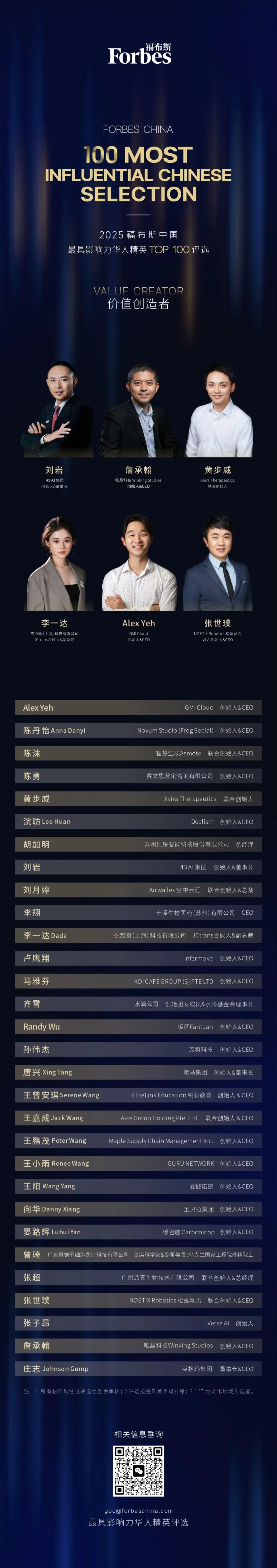 02. 评选方法 本次评选采用申报制。在六个月的申报期内,组委会收到数百份申报材料,对初筛候选人进行线上访谈,并综合评估其影响力,最终确定入选名单。 与往年相比,今年入选者类型更细分、国际化程度更高、跨界维度更广。需要特别指出的是,评选组委会今年收到的申报数量、三大类别的候选人自身及所在的公司的综合实力及影响力都远超以往。 “产业重塑者”高度集中于科技与工业制造、生物医药、消费与零售三大领域。候选人所在公司与业务横跨多个量级,从数十亿人民币的创业公司到数万亿美元的科技巨头均在其列。多数候选人领导的企业在2024-2025年展现出强劲的增长韧性或明确的复苏和增长趋势。 “价值创造者”集中于前沿科技(AI、机器人、生物医药)、全球化消费品牌、企业服务及SaaS赛道。普遍拥有高估值或斩获从数千万美元到数十亿美元不等的大额融资,同时展现出极高的营收增长率,许多公司实现翻倍甚至数倍的业绩突破。驱动这些企业成长的是一群30岁上下、高知敢为、勇于颠覆的年轻创始人,他们用新思维、新技术在传统领域或全新赛道中快速崛起。 “趋势勘探者”是隐藏在商业繁荣背后的“造雨人”和“规则书写者”。他们通过资本布局未来、学术思想引领方向、文化艺术传播搭建桥梁,构建起连接中国与全球、科研与产业、资本与创新的超级节点。其影响力难以用传统财务指标衡量,而是体现在生态规模、学术荣誉与对未来产业的精准预判上。 03. 评选解读 “产业重塑者”定义了商业世界的“广度与稳定”。 30位“产业重塑者”在成熟产业或宏大叙事中执掌舵盘。他们是现有游戏规则的维护者与规模扩张者。入选者多为大型上市公司、全球500强或老牌专业机构的最高管理层。其成就是组织影响力的延伸,公司市值或估值是重要量化指标。 这部分群体中包含多位执掌万亿美金市值巨头的行业领袖,比如刘念宁所在的英伟达市值超3万亿美元,王昊所在的特斯拉市值约1.53万亿美元。许敏所在的宝洁市值约3500亿美元。他们掌舵的业务本身就是巨头中的核心,如特斯拉中国占全球销量近40%、大中华区为宝洁全球第二大市场。 另外约57%的候选人与上市公司存在关联,他们的企业遍布纽交所、纳斯达克、港交所等全球主要交易所,反映出这些精英与资本市场的紧密链接和广泛的公众影响力。 “产业重塑者”们的行业分布高度集中,清晰勾勒出当前华人精英影响力的核心赛道——科技与工业制造、生物医药与生命科学、消费与零售三大领域。在这些产业中,华人精英正在引领技术创新和产业升级,也因此获得高估值/市值。30位入选者所在的企业总体估值/市值约为70,000亿美元。 吴华鹏于2019年加入秦淮数据集团担任中国区总裁,2022年出任集团CEO,带领集团持续专注超大规模数据中心主营业务。他在20余年的互联网行业生涯中始终专注于中国算力产业生态价值重构,是中国互联网顶层架构设计的持续耕耘者和思想传播者。秦淮数据目前估值近300亿人民币。 值得一提的是,多位女性领袖的表现极为亮眼,均在关键领域执掌重要业务。掌舵耐克大中华区的董炜(Angela Dong)、担任LinkedIn(领英)大中华区总经理的王茜、百事集团亚太区CEO谢长安(Anne Tse)、麦当劳中国CEO张家茵,杜邦公司全球副总裁、交通与材料全球总裁吴桐,NVIDIA英伟达全球副总裁刘念宁,强生创新制药中国区总裁黄琛(Cherry Huang),亚马逊全球副总裁、亚马逊全球开店全球业务负责人戴竫斐(Cindy Tai),以及宝洁大中华区董事长兼CEO许敏,她们是入选名单中不可或缺的女性力量。 “产业重塑者”以成熟的治理体系、深厚的全球化管理经验和稳健的资本表现,让华人力量在复杂环境中保持定力、明确航向,构成了这份入选名单的“压舱石”。 “价值创造者”定义了“速度与未来”。 他们是从0到1的开创者,其影响力与所创办或掌控的企业价值深度绑定。其核心画像为创始人、CEO,所引领的企业已具备相当规模,并有明确的、可量化的估值(无论是公开市值还是私募融资估值)。他们是新经济的代表,是入选名单中商业活力的核心体现。 这类候选人的数据亮点体现在极致的增长速度、年轻的创始团队和颠覆性的估值上,也是未来感的最佳展现。他们的平均年龄为38.5岁,“90后”、“95后”成为中坚力量。他们是真正的“数字原住民”,以其对新技术和新消费趋势的敏锐洞察力构建起自己的商业帝国。 30岁的GMI Cloud创始人兼CEO Alex Yeh 叶威延正是这一代的代表人物。当全球 AI 产业迈入 “算力决胜” 的关键拐点 ,从技术创新突破到全球生态共建,从算力赋能到商业价值爆发,Alex Yeh在短短两年多的时间将GMI Cloud打造成全球增长最快的AI云计算服务商,GMI Cloud 目前已经成长为全球六大 Reference Platform NVIDIA Cloud Partner 之一。 28岁的陈丹怡Anna Danyi是Novum Studio/Frog Social创始人兼CEO,凭借对Z世代社交文化的深刻理解,构建了横跨欧美、拉美与中东的新兴社交矩阵,其公司估值高达近3亿美元。 32岁的NOETIX Robotics松延动力联合创始人兼CEO张世璞仅2年时间推动NOETIX在全球人形机器人领域跻身前列,订单量突破2,500台,自研专利超30项,更率先推出万元以下高性能人形机器人BUMI,以硬核实力标注了中国硬科技力量崛起的新高度。 33岁的Versa AI 创始人张子昂正以生成式AI重塑全球娱乐版图