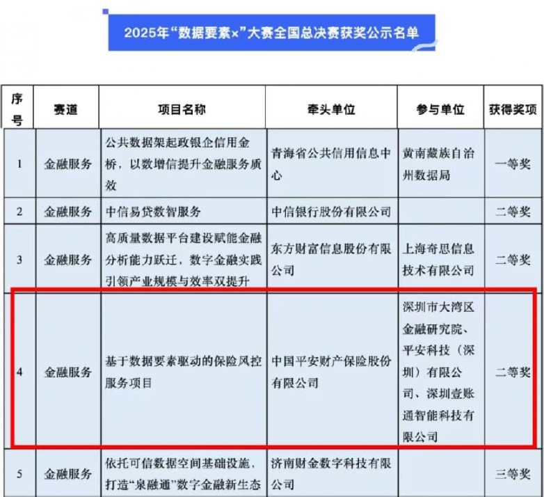 近日,国家数据局公示2025年“数据要素×”大赛全国总决赛获奖项目名单,由平安产险、金融壹账通、平安科技、深圳市大湾区金融研究院联合申报的《基于数据要素驱动的保险风控服务项目》(以下简称“数字化风控项目”或“该项目”)从全国2.2万个参赛项目中脱颖而出,荣获全国金融服务赛道总决赛二等奖,实现了历史性突破。